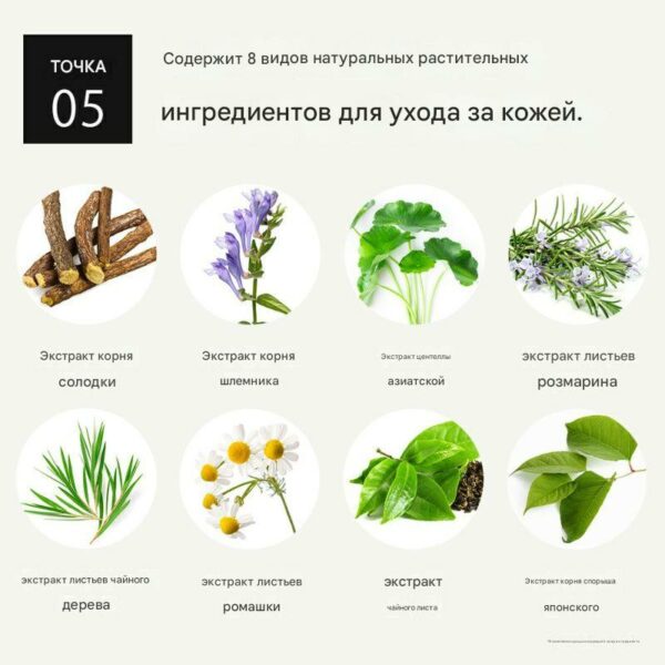 Экстракты центеллы, чайного дерева, ромашки, розмарина и зелёного чая для успокоения.